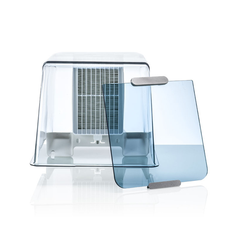 Le Air Manager optionnel de la Ultimaker 2+ Connect est conçu pour augmenter simplement et efficacement la sécurité des utilisateurs. L'Air Manager se compose d'un capot supérieur, d'un filtre et d'une porte frontal. L'utilisation correcte de l'Air Manager minimise les risques d'émission liés aux particules fines causés par les matériaux d'impression 3D.