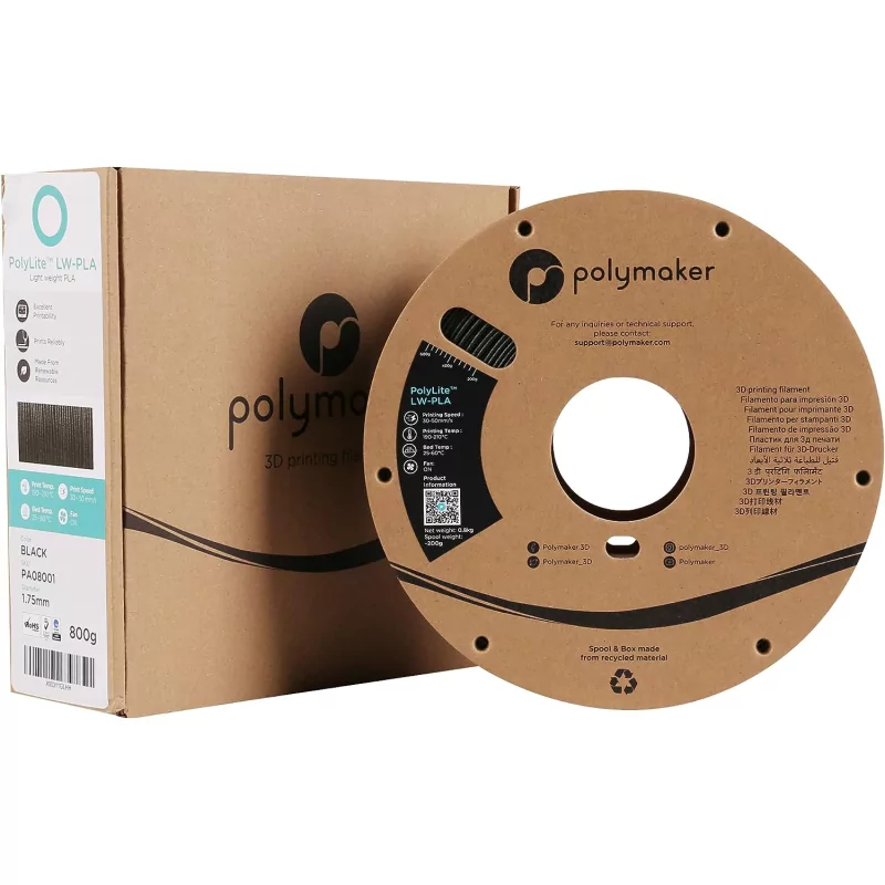 Le PolyLite™ LW-PLA Noir de Polymaker est un PLA spécialement expansé conçu pour être imprimé avec des paramètres similaires au PLA ordinaire, mais avec la moitié du poids et une densité plus faibles.