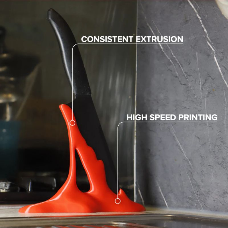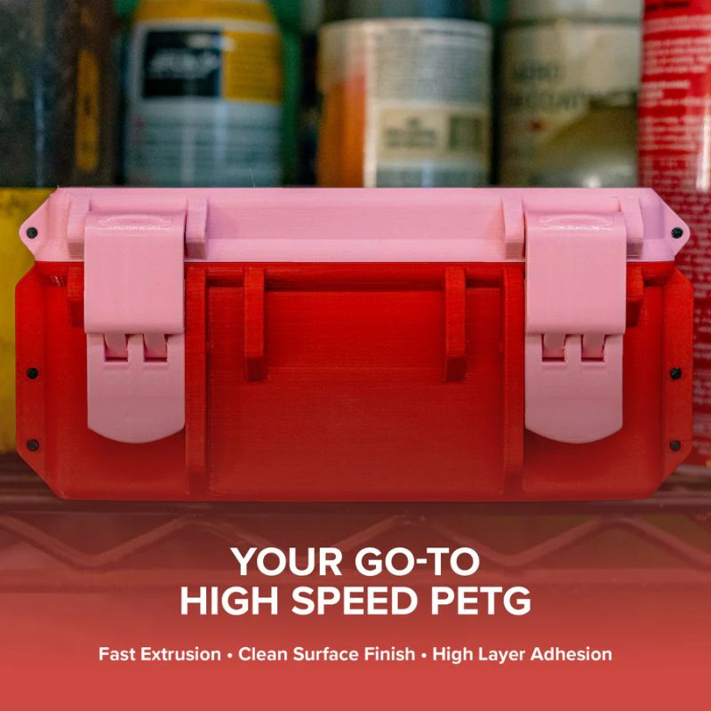 Haute vitesse d’impression sans perte de qualité : Grâce à sa formulation révisée, le Polymaker PETG Rouge supporte des vitesses d’impression jusqu’à 300 mm/s, voire 500 mm/s avec un hotend adapté. L’extrusion reste stable, sans sous-extrusion ni stringing excessif. Ce gain de vitesse permet d’accélérer la production de pièces techniques tout en maintenant une finition propre et régulière.