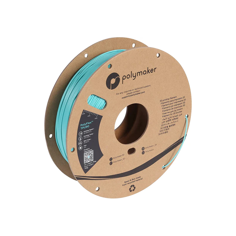 Élastomère simple à imprimer : le TPU90 Polymaker Teal de Polymaker est un filament 3D simple à extruder et compatible avec toutes les imprimantes du marché acceptant les diamètres de filament 1.75 et 2.85 mm. Il est aussi plus rapide à imprimer qu'un TPU95 standard.