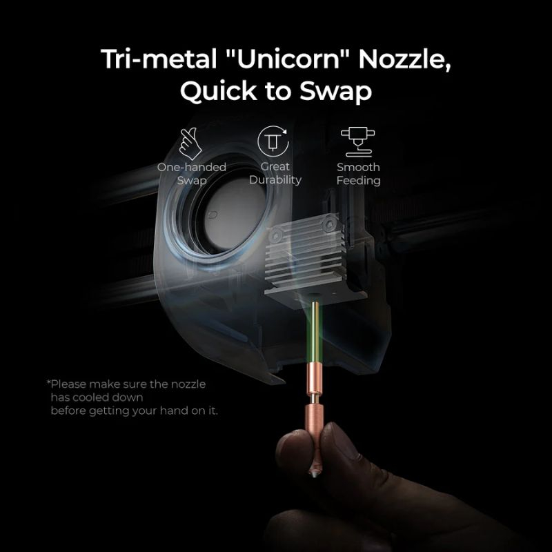 Les buses interchangeables rapidement permettent de changer de diamètre ou de matériau en quelques secondes. Cela réduit considérablement les temps d’arrêt et limite les erreurs de manipulation, facilitant l’utilisation multimatériaux et multicolores.