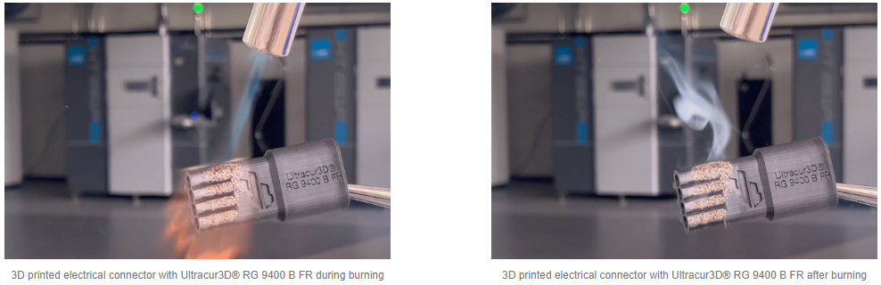 Les matériaux ignifuges cesseront de brûler une fois la source de flamme retirée. Cette caractéristique de l'Ultracur3D® RG 9400 B FR le rend idéal pour les applications exigeantes dans l'électronique comme les supports de câbles, les connecteurs électriques, les boîtiers de batterie et les applications électriques à haute puissance. Le matériau est également adapté aux gabarits et montages personnalisés ainsi qu'aux pièces de rechange pour les environnements industriels avec des sources d'inflammation et de HDT élevées.