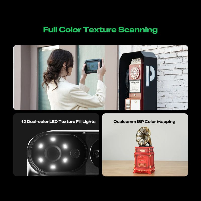 Caméra RGB à obturateur global et traitement par processeur Qualcomm assure des textures riches et naturelles, complétées par un éclairage auxiliaire pour des captures photoréalistes.