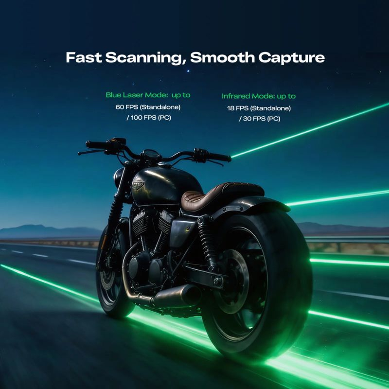 Acquisition jusqu’à 100 FPS sur PC, assurant des scans rapides et fluides, même pour des objets volumineux ou complexes, optimisant ainsi le temps de production et d’inspection.