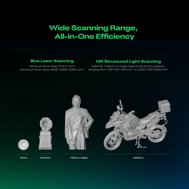 Combine laser bleu et lumière NIR pour une capture efficace sur tout type d’objet, petit ou volumineux.