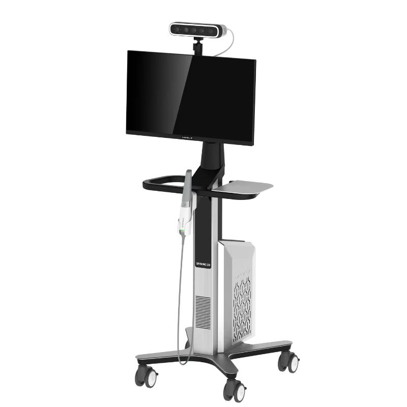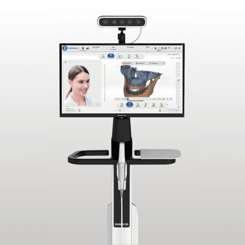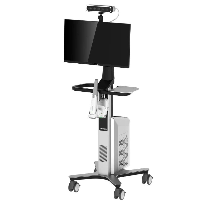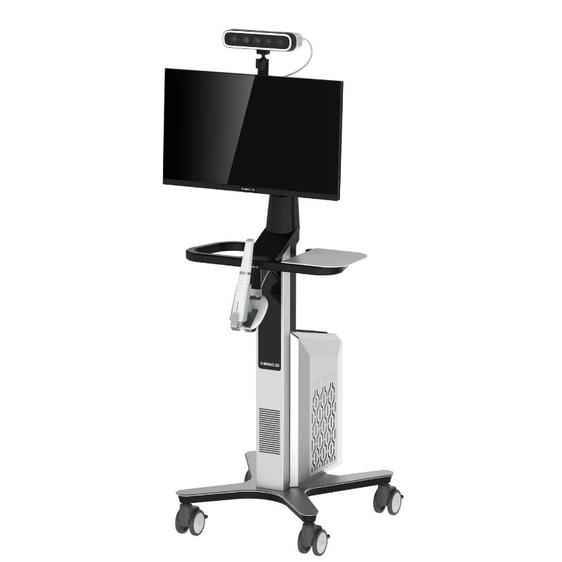 La Shining 3D e-Motion Workstation a été conçue pour offrir un véritable espace dédié au flux numérique dentaire. Plus qu’un simple chariot, c’est une station intégrée qui réunit support scanner intraoral, support scanner facial, écran, ordinateur médical et surface de travail optimisée. Son ergonomie facilite les prises d’empreintes intraorales, améliore la posture du praticien et fluidifie les gestes cliniques, que ce soit au fauteuil ou au laboratoire.