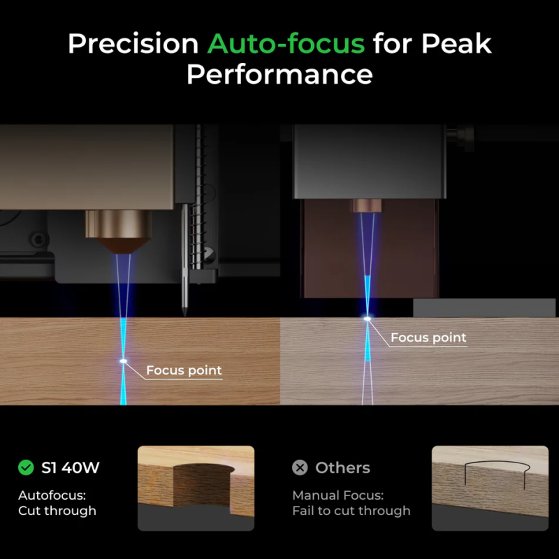 Le xTool S1 offre une mesure précise de la mise au point au niveau de l'ordinateur et améliore la puissance de coupe en guidant le point vers le bas sous la surface de coupe grâce au système de mise au point automatique.