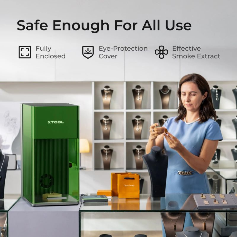 Il permet gravure et découpe sur métal, bois, acrylique et cuir avec précision sub‑millimétrique, vitesse jusqu’à 10 000 mm/s et contrôle via xTool Creative Space ou LightBurn. Idéal pour les ateliers et productions en série.