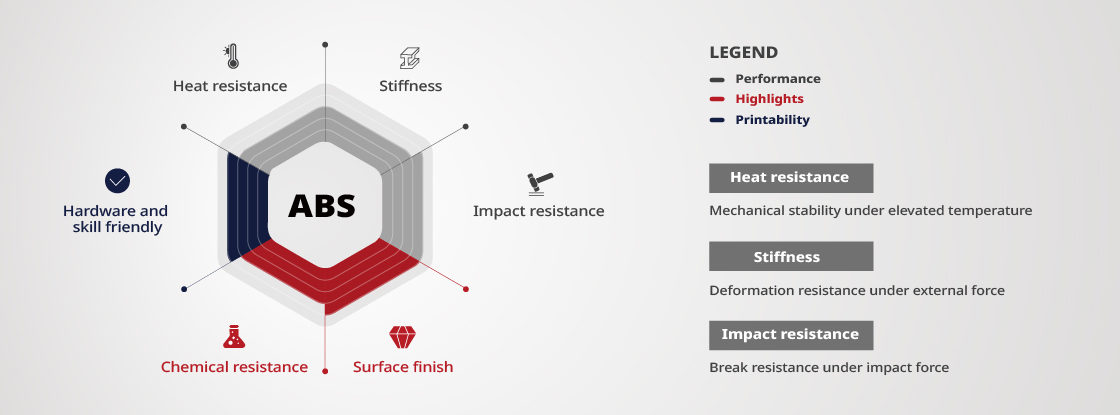 De professionele kwaliteit maakt het zeer veelzijdig en sterk voor mechanische en technische onderdelen. ABS wordt veel gebruikt in de industrie en is een van de meest gebruikte materialen in 3D-printing.
