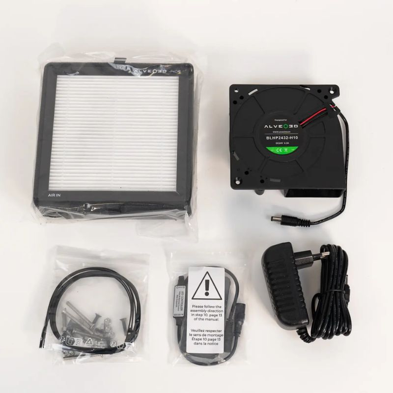 De kit bevat: voeding en DC-connector, P4DR-filter, H10 blower, NBR70 O-ring afdichtingen, afstandsbedieningsset met IR-ontvanger, bevestigingsmateriaal en kabelbinders. Print enkel de behuizingsonderdelen met een filament dat bestand is tegen 60°C.