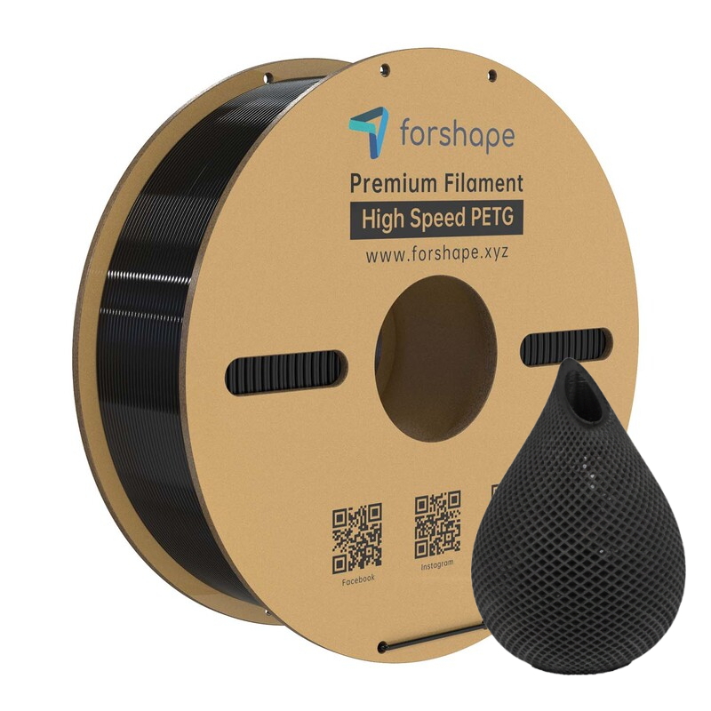 Het High-Speed PETG Forshape Zwart filament is ontwikkeld voor hogesnelheidsprinten tot 600 mm/s, wat 10 keer sneller is dan standaard PETG, waardoor aanzienlijke printtijd wordt bespaard.