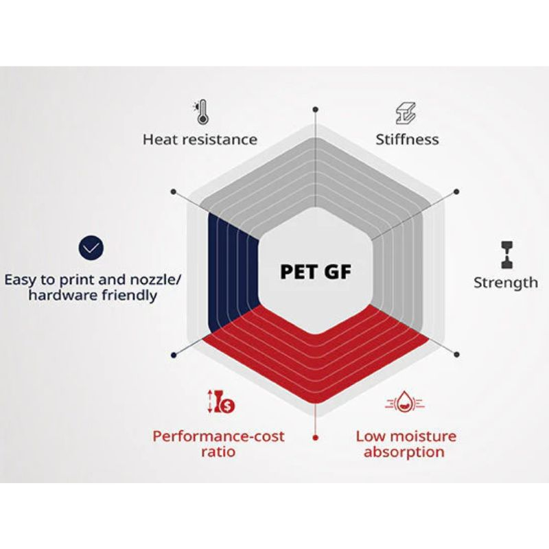 Thermische stabiliteit na nabehandeling: Na nabehandeling behoudt PET GF zijn eigenschappen tot 120 °C. Ideaal voor toepassingen bij warmte terwijl de dimensionale stabiliteit van geprinte onderdelen behouden blijft.